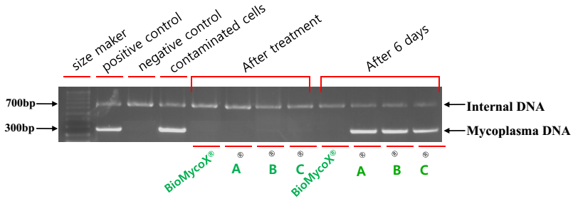 4, 7: Mycoplasma infected cell / 1 passage after treatment