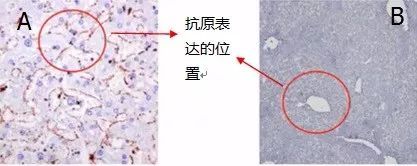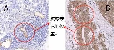 下圖樣本是正常人肝血管組織,目標(biāo)蛋白是α-平滑機(jī)動蛋白,A圖是我們想得到的結(jié)果,B圖是做出來的實(shí)驗結(jié)果,與A圖相比,在紅圈處并沒有檢測到抗原。