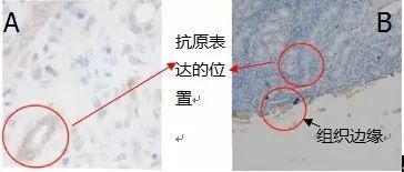 下圖樣本是人小腸粘膜組織,目標(biāo)蛋白IL-10,A圖是我們想得到的結(jié)果,B圖是做出來的實(shí)驗結(jié)果,在與A圖相同位置的B圖中沒有檢測到抗原,反而在組織邊緣檢測到組織表達(dá)。