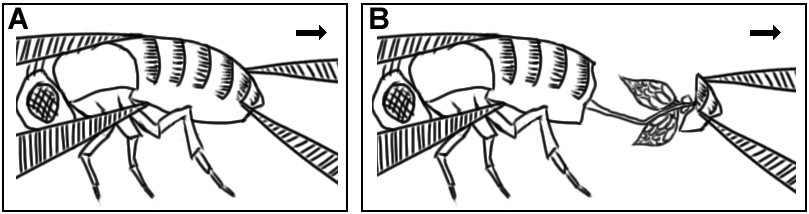 ?????? A. 用鑷子輕輕固定住果蠅腹部的前部,用另一把鑷子夾住果蠅腹部的倒數(shù)第二個(gè)體節(jié)。B. 左手鑷子固定果蠅身體,右手鑷子將果蠅尾部兩個(gè)體節(jié)輕輕拉出,卵巢會(huì)被一起扯出。這時(shí)不必對(duì)解剖組織進(jìn)行清理,迅速開始解剖下一只果蠅。左撇子的拿鑷子解剖方式與此呈鏡像對(duì)稱。