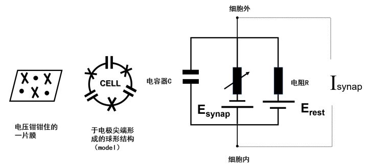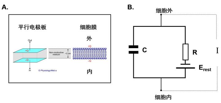 細(xì)胞膜由絕緣的磷脂雙分子層構(gòu)成,膜上有很多離子通道和受體,離子通道允許帶電荷離子進(jìn)出。電學(xué)上講,一種離子通道相當(dāng)于一個微小的電壓源。在這些通道關(guān)閉的情況下, 細(xì)胞膜本身相當(dāng)于電介質(zhì),而靠近細(xì)胞膜的細(xì)胞內(nèi)液層和外液層相當(dāng)于電容器的兩個極板,可以儲存電荷。由于不知道細(xì)胞膜上都有些什么,我們暫且把膜上所有負(fù)責(zé)物質(zhì)交換的場所都當(dāng)成電阻。而Erest代表電阻的在靜息時的電動勢。這也是最簡單的阻-容電路(Resistance-Capacities circuit; RC電路)成分。
