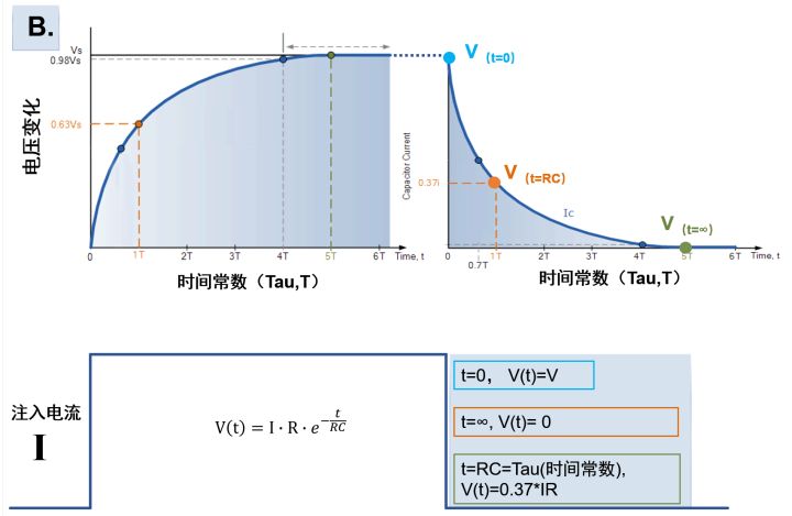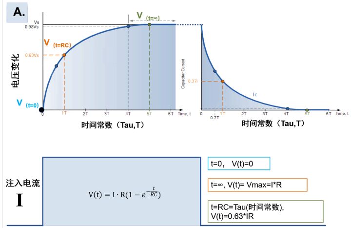 根據(jù)RC電路的電壓反應(yīng)式,以及歐姆定律和基爾霍夫電流定律,我們知道沒有電流注入時(t=0),電路中不會用電流變化;當(dāng)超長時間注入電流時,電容器短暫的充放電就可以忽略不計(jì),所以電壓反應(yīng)可以近似地看作只有膜電阻做出了貢獻(xiàn);而當(dāng)注入一個時間常數(shù)(電阻×電容)的電流時,根據(jù)反應(yīng)式可以知道V(t)=0.63I*R。