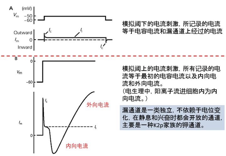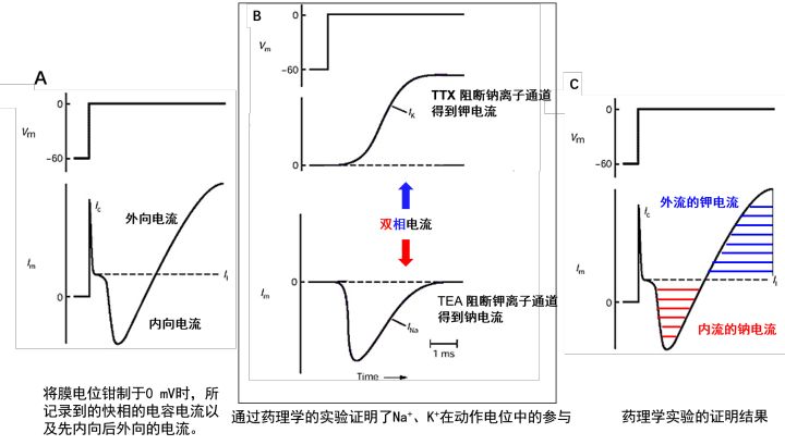 Hodgkin 和 Huxley兩人首先去極化槍烏賊的軸突近10 mV(相當(dāng)于只有微小的電流刺激,還不足以使細(xì)胞爆發(fā)動作電位),發(fā)現(xiàn)電流成分只有早晚期電容的快速充放電以及漏通道上不隨電壓變化的電流。而有意思的是,當(dāng)將軸突的膜電位去極化到0 mV,(一般細(xì)胞的閾值是-40~-30 mV甚至更去極化),相當(dāng)于細(xì)胞收到了很大的刺激,從而發(fā)現(xiàn)了三相電流成分:①最早的快速電容充電電流;②快速的內(nèi)向電流;③稍慢的外向電流。這些電流成分是什么?