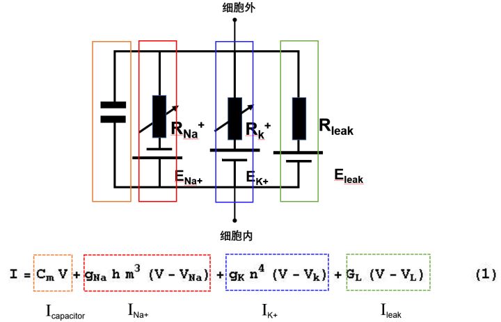 事實(shí)上,我們的大腦并沒有一根電極注入電流;但一個神經(jīng)元往往接受成千上萬個突觸的輸入,而突觸的輸入(電-化學(xué)-電的信號傳遞)就相當(dāng)于向神經(jīng)元注入了電流。這時電流會有三個走向:①電容器②離子通道③漏通道。