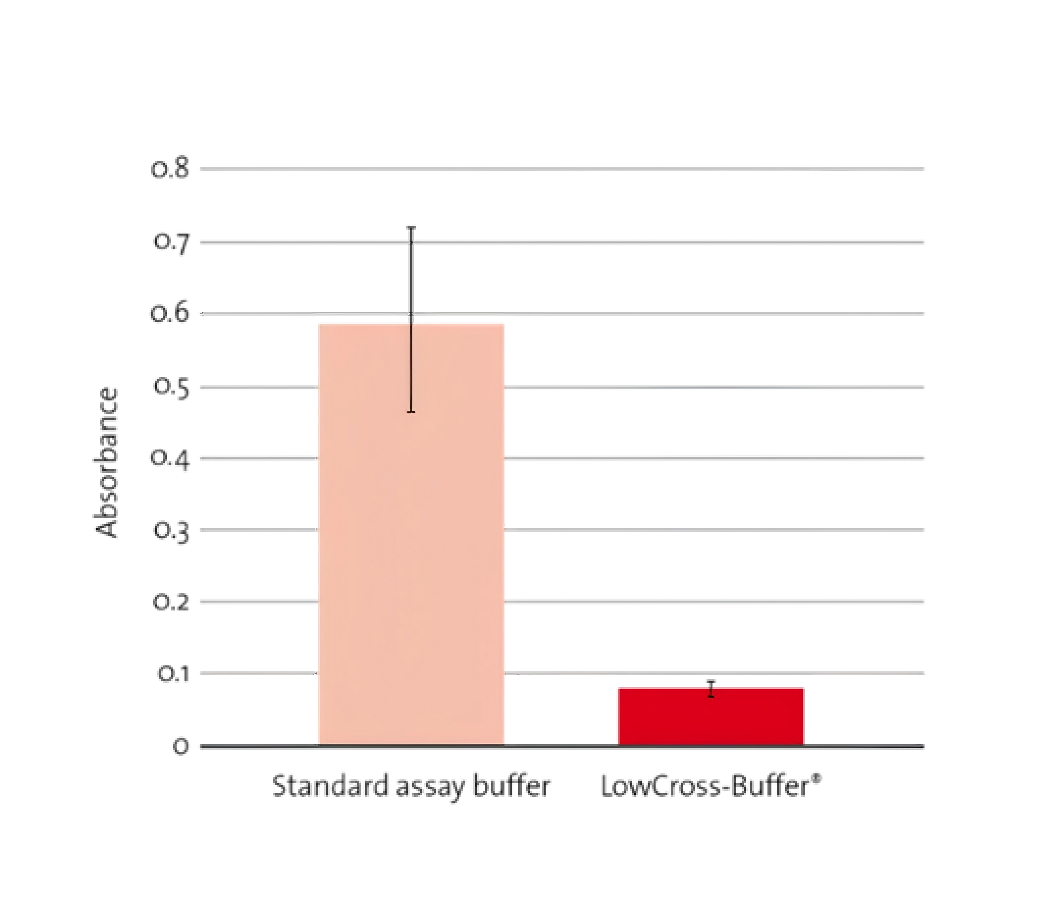 圖一:在ELISA檢測(cè)中,相較于普通緩沖液,LowCross-Buffer® (CR303) 可顯著降低由交叉反應(yīng)引起的背景干擾,有效提升檢測(cè)信噪比。