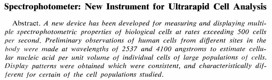 Gucker的裝置建成后,科學(xué)家們又開始嘗試將這個技術(shù)應(yīng)用到細(xì)胞計數(shù)上。1953年,Crosland-Taylor在血細(xì)胞計數(shù)儀上使用了類似Gucker裝置的鞘流技術(shù)和光學(xué)系統(tǒng),第一次完整實(shí)現(xiàn)了Moldavan的最初想法。很多產(chǎn)商非??春眠@種計數(shù)儀,紛紛投入資源開發(fā)類似的分析設(shè)備。至上個世紀(jì)50年代末,相關(guān)方法學(xué)原理和應(yīng)用都已成熟,流式細(xì)胞術(shù)初具雛形。
